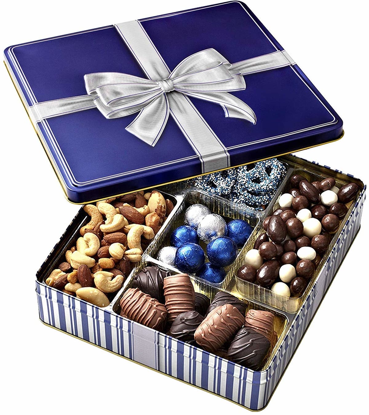 This beautiful box is filled with a delicious mix of English toffee, blue and silver foiled chocolate caramel balls, roasted mixed nuts and blue and white chocolate covered pretzels.
