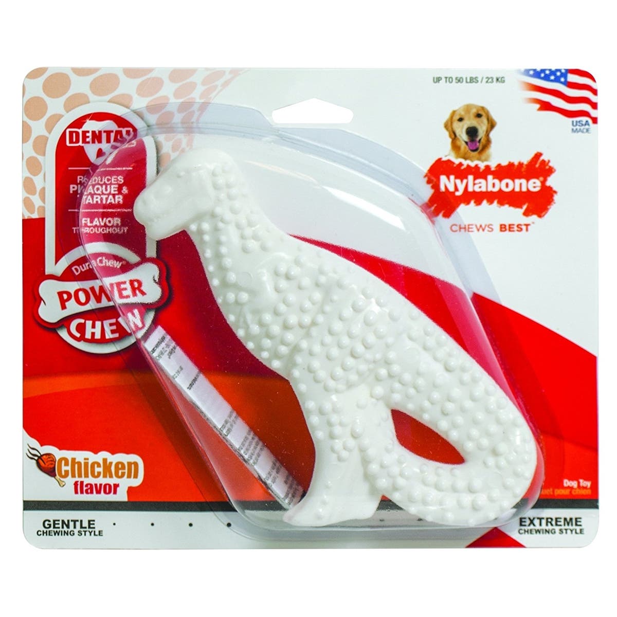 This dino power chew is tons of fun for your pup, but also good for her teeth. The tough, durable nylon keeps even the most aggressive chewers busy, and the rounded nubs help clean teeth and control plaque and tartar. This particular T-rex treat intended for dogs weighing up to 50 pounds.