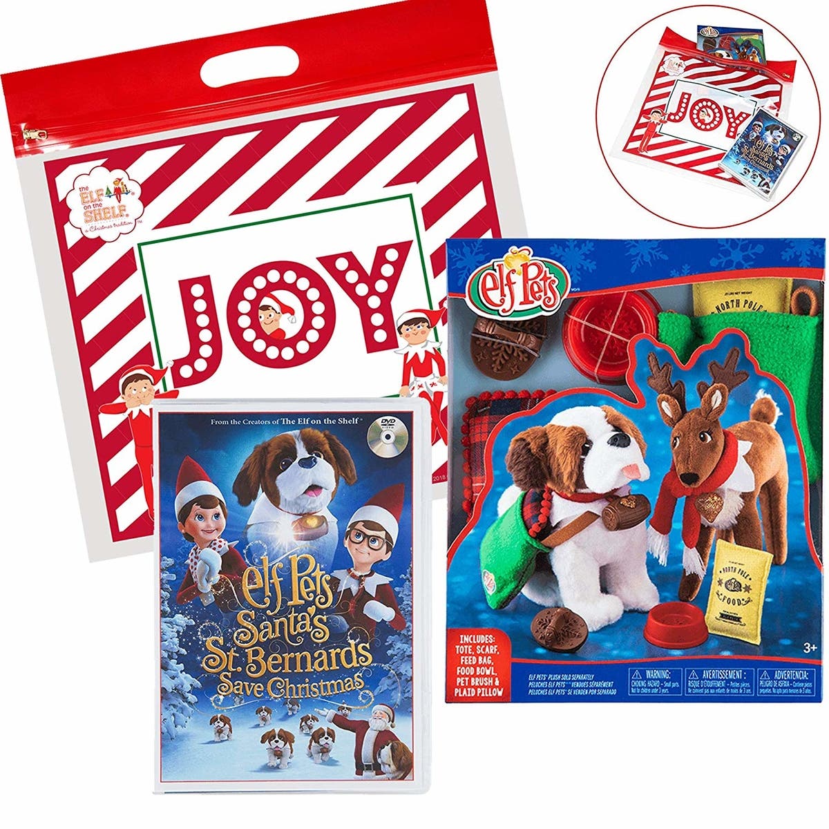 There's even The Elf on the Shelf Elf Pets Christmas set, which includes the "Santa's St. Bernards Save Christmas" movie on DVD and a tote, scarf, feed bag, bowl, pet brush and plaid pillow for your animal plush.