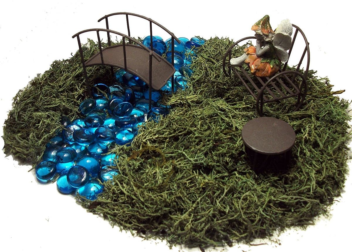 This starter set comes with moss, glass stones, a fairy, fairy furniture and a fairy bridge — everything you need to make your own magical fairy garden right at home.