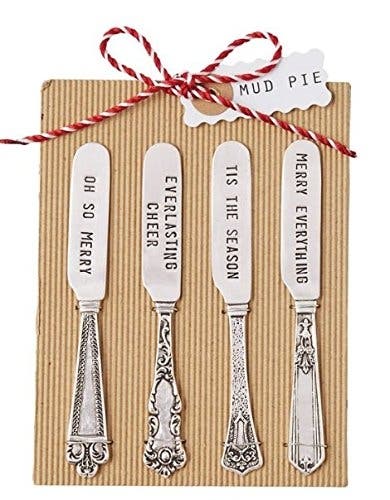 Have you ever seen a more festive set of spreaders? Each one has its own decorative handle and holiday message. Pass the cheese, please!