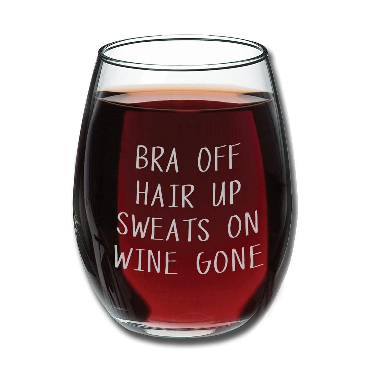 "Bra Off, Hair Up, Sweats On, Wine Gone" 15-Ounce Wine Glass, $14.97