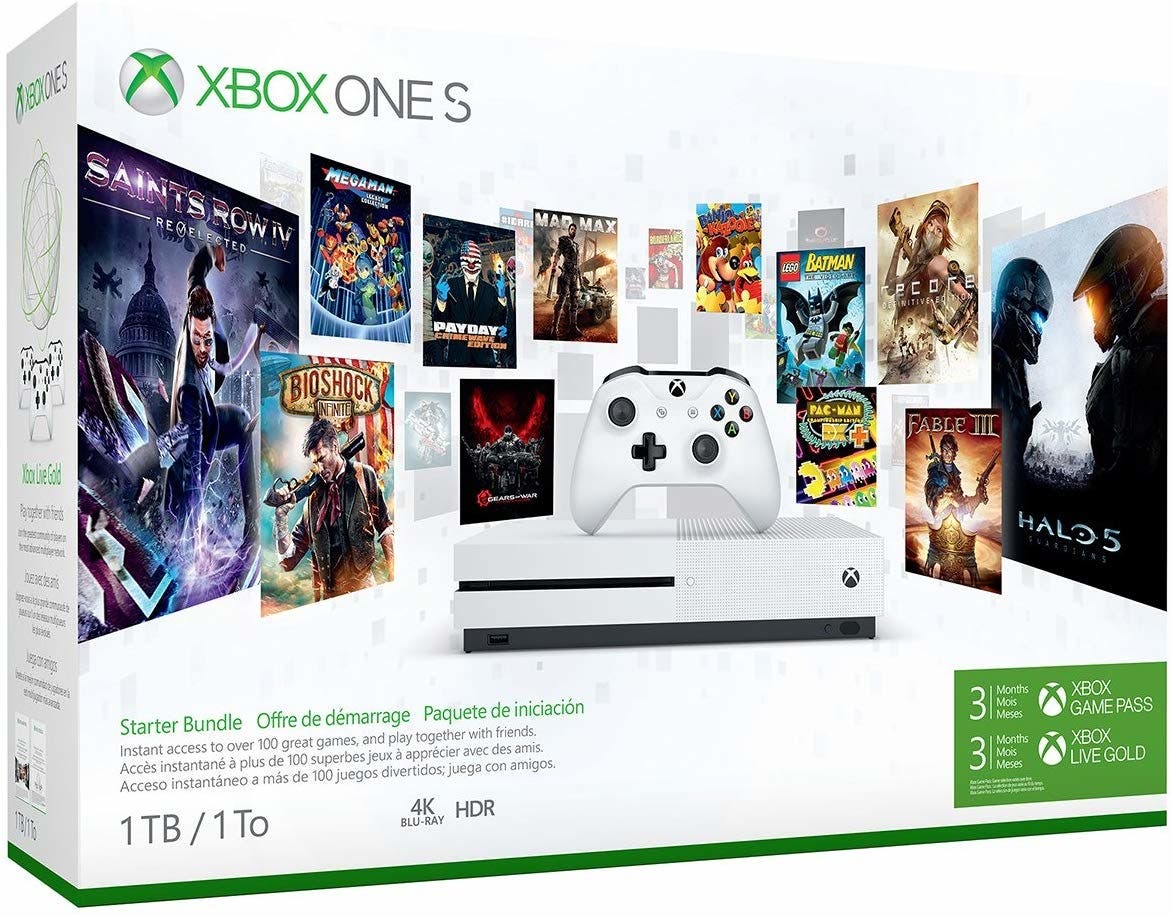 While admittedly pricy, this bundle is actually a bargain. It includes an Xbox One S 1TB Console, wireless Controller, 4K capable HDMI cable, AC power cable, a 3-month Xbox game pass, and 3 months of Xbox live Gold. This means you get instant access to over 100 great games. You can also watch 4K Blu-ray movies and stream 4K video on Netflix, Amazon and Hulu. Subscription fees may apply.