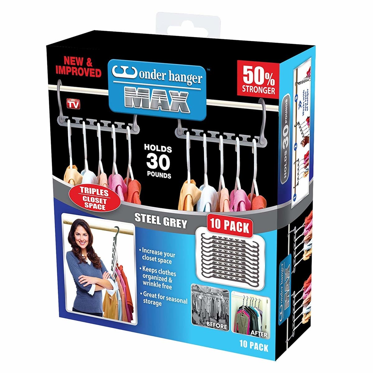 Each Wonder Hanger Max has five slots and holds up to 30 pounds. They work with all hanger types and are perfect for anyone try to consolidate their clothing. The Wonder Hanger Max packs can give you up to three times more closet space.