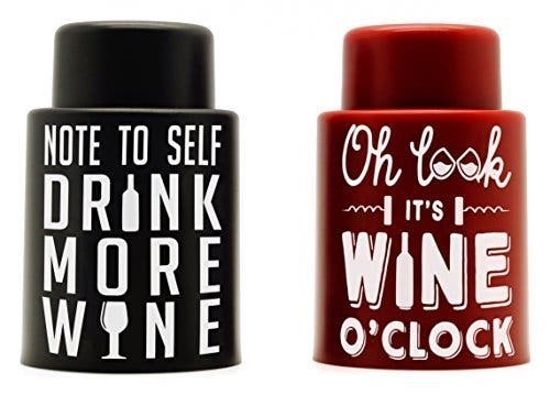 It is wine o'clock somewhere, and we hope you're ready to celebrate accordingly. These vacuum stoppers are designed to preserve your favorite wines for weeks, and who doesn't love the words of wisdom printed on them?
