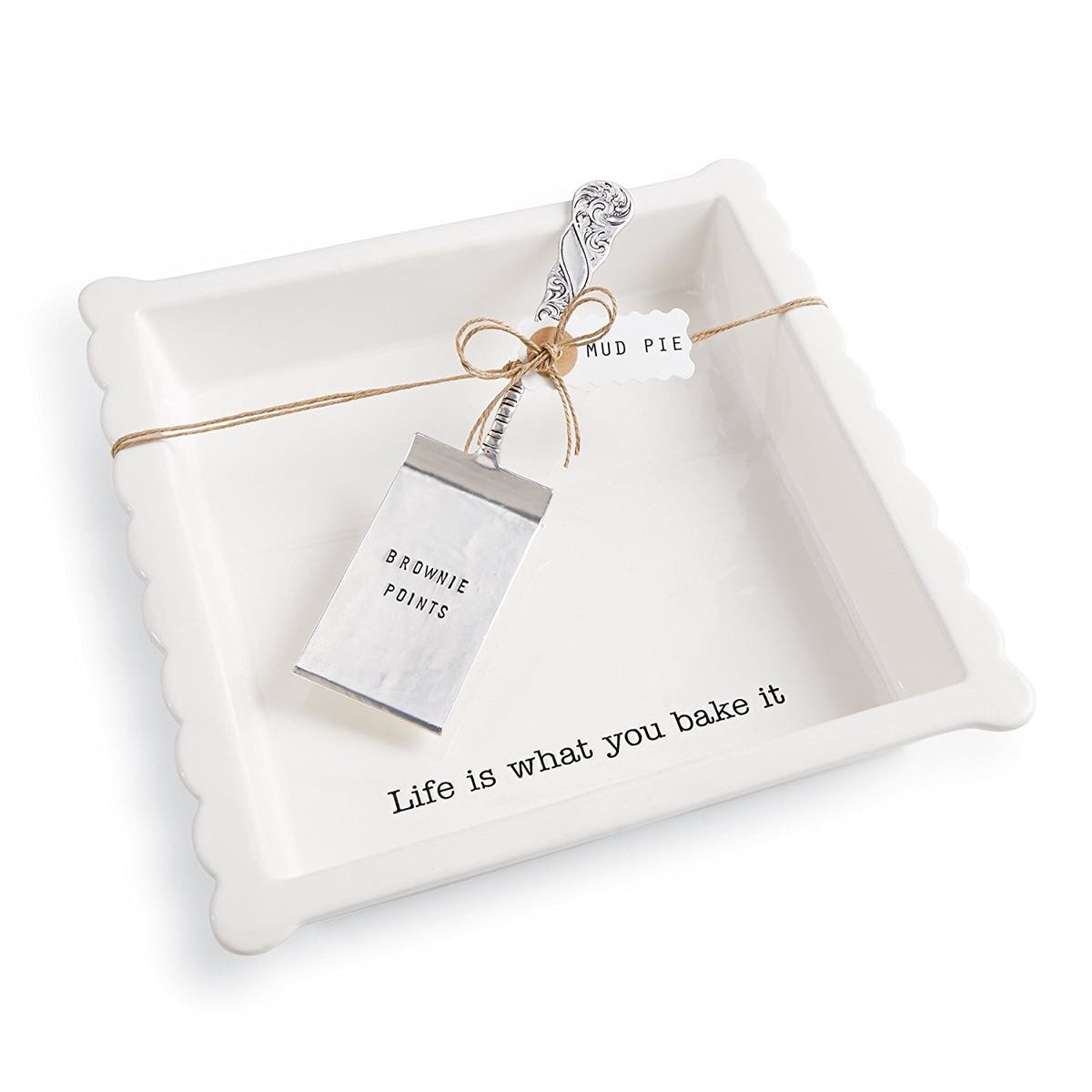 Never have we ever seen a better way to bake and serve up brownies! The dish says "Life is what you bake it," and the server has the words "brownie points" on it.