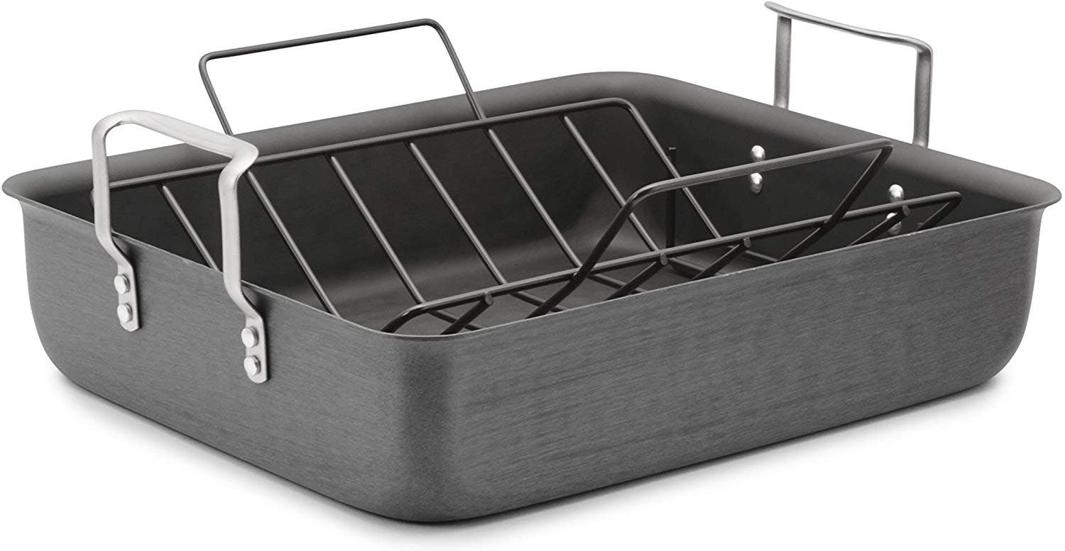 This top-rated roasting pan has the capacity to cook a turkey up to 25 pounds. It's made of hard-anodized aluminum for even heating, and the nonstick rack elevates foods for even browning. The pan and rack are oven safe up to 450 degrees.