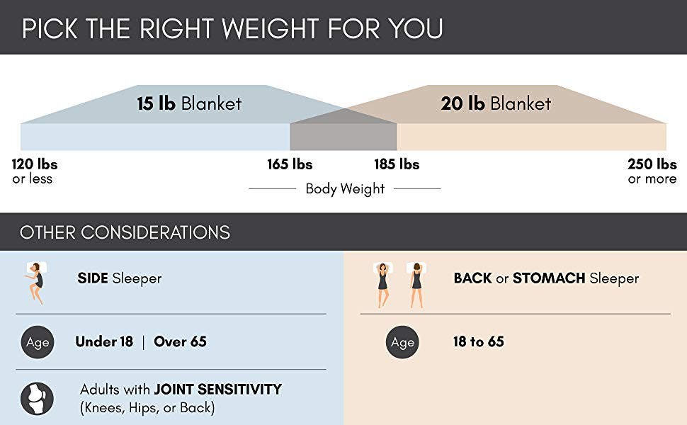 You can choose between a 15-pound and 20-pound Baloo weighted blanket. The right size for you will depend on your your weight, age, sleeping preferences and other health considerations. (See the chart below for more specific details.)