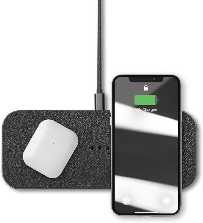 This Qi-Certified charger can quickly charge two devices at once. It's made of high grade aluminum and has a premium quality Italian leather exterior. A USB C and 30-watt charging plug are included with your purchase. The Courant Catch:2 is compatible with most iPhone, Samsung, Google, Blackberry and Motorola phone models.