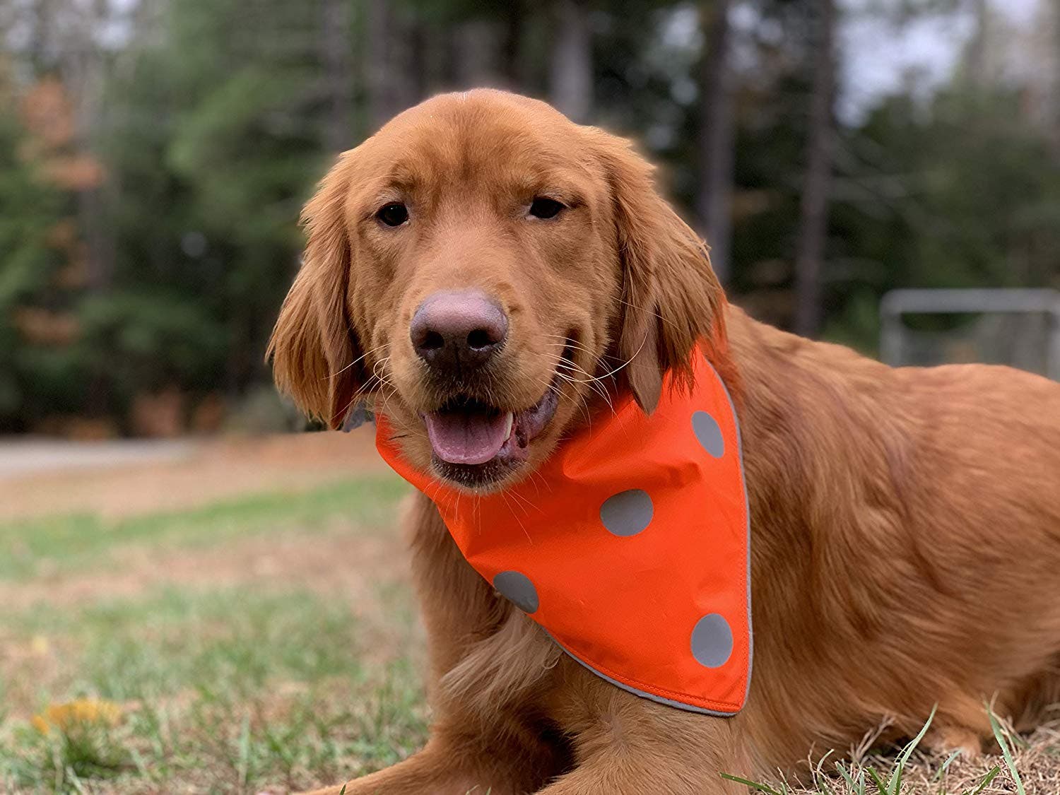 Keep your pup safe in the dark with this reflective, easy-to-fasten dog bandana. The bright polka dot design is both fashionable and functional! Available in sizes from XX-small to X-large.