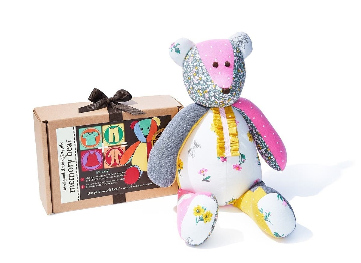 With this unique kit, you choose the clothes you want to be made into a personalized Patchwork Bear. It's perfect for baby clothes, team jerseys, special occasion ensembles or any other outfits you want to commemorate in sweet and cuddly teddy bear form.