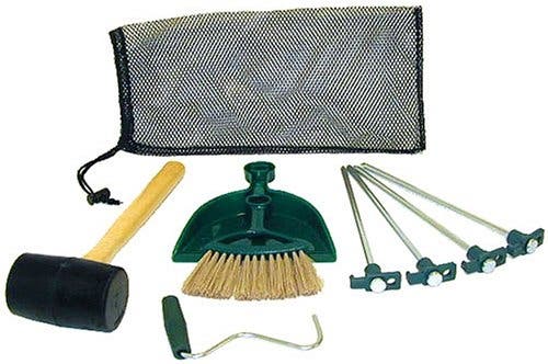 Don't forget all your setup essentials! This easy-to-carry kit comes with four 10-inch steel tent pegs, a rubber mallet to secure stakes in the ground, a hand broom and dustpan to sweep dirt away and a steel rod stake-puller for easy stake removal.