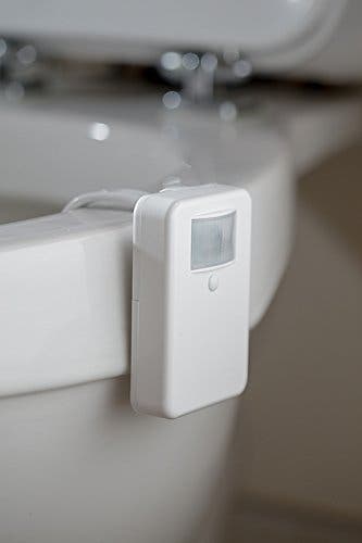 The LumiLux LED toilet bowl has a built-in motion sensor that detects body heat, so it automatically illuminates when you enter and turns off when you leave. You can choose from any one of 16 different LED colors, or set it to carousel mode so it seamlessly cycles through them all.