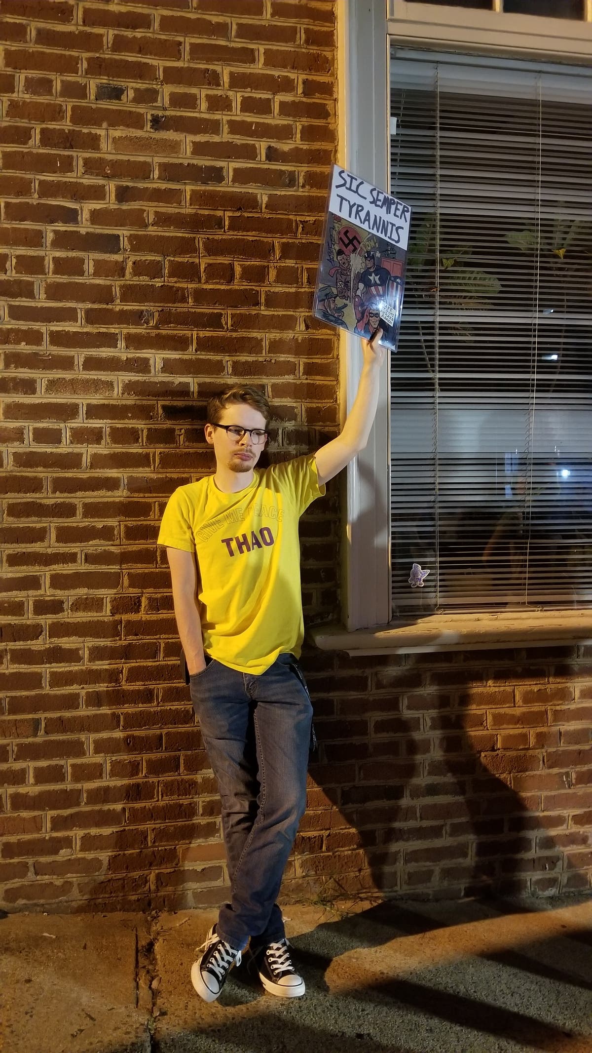 Casey S., 26, grew up in Charlottesville. He stood silent at the vigil holding a sign with a cartoon depiction of Captain America punching Hitler and the phrase "Sic Semper Tyrannis," which translates to "thus always to tyrants."