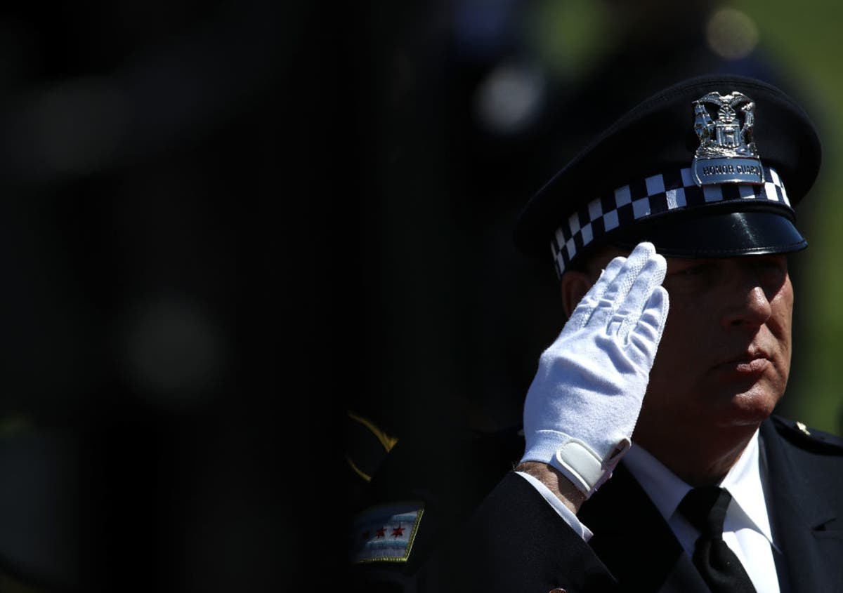 FILE PHOTO: A member of a police officer honor guard team salutes during the playing of the national anthem at the 36th annual National Peace Officers' Memorial Service at the U.S. Capitol on May 15, 2017 in Washington, DC. The service is part of National Police Week and honors police officers across the country, and the families of those who died in the line of duty. (Photo by Win McNamee/Getty Images)