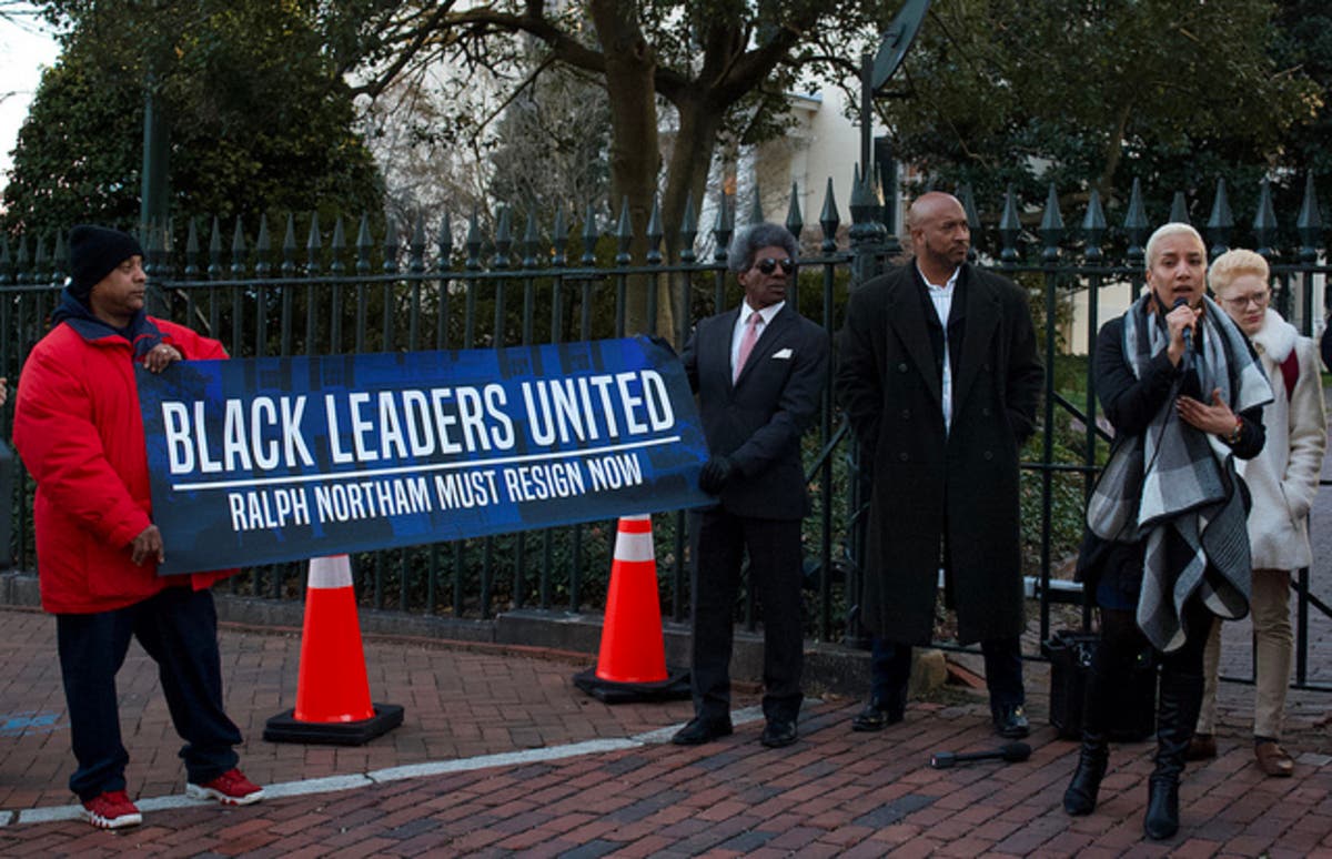 Dozens of protesters gathered Wednesday to demand that Virginia Gov. Ralph Northam resign; earlier he canceled a Black History Month event.