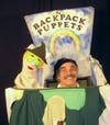 Then I put on my BackPack stage, and the puppet show begins. It is the story of a puppet who has to learn how to see, hear taste, touch and smell. After getting the five senses, the character wants to meet real live dinosaurs so a kindly wizard sends it back in time to the Mesozoic era. There it meets two plant eaters and a meat eater. With the help of the children, we all get home safely.