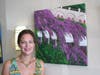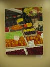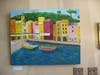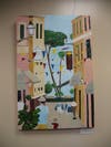 Bohn said it takes her about a week to complete one painting. It took her approximately six weeks since the return from her trip to complete five paintings. The exhibition currently on display at Beanetics is titled "On the Italian Riviera". The first painting seen upon entering the coffee shop is "Portofino", a lovely painting of the wonderful port town of Portofino, Italy. It is rich in color. The second painting is "Windows in Paraggi", a piece full of light purple flowers hanging from windows. The third painting is "Rowboat", a single rowboat in the bluest sea. One almost feels the water. The fourth painting "La Dolce Vita (The Sweet Life)", gives the onlooker a colorful view of a narrow street in where a father and child holding hands are taking a stroll, not far there is an gelato shop with outdoor seating. The fifth painting is "Market in Santa Margherita". It is vibrant with colors of the various fruit display.