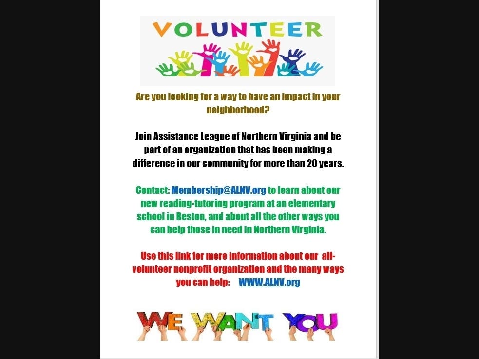 Are you interested in making a difference for local children? Assistance League of Northern Virginia is looking for additional members to help support the food, clothing and literacy programs it offers at several Title 1 elementary schools throughout the area. Assistance League will be starting an additional reading program at an elementary school in Reston in the very near future and welcomes additional participants who are interested in helping young students develop their reading skills.