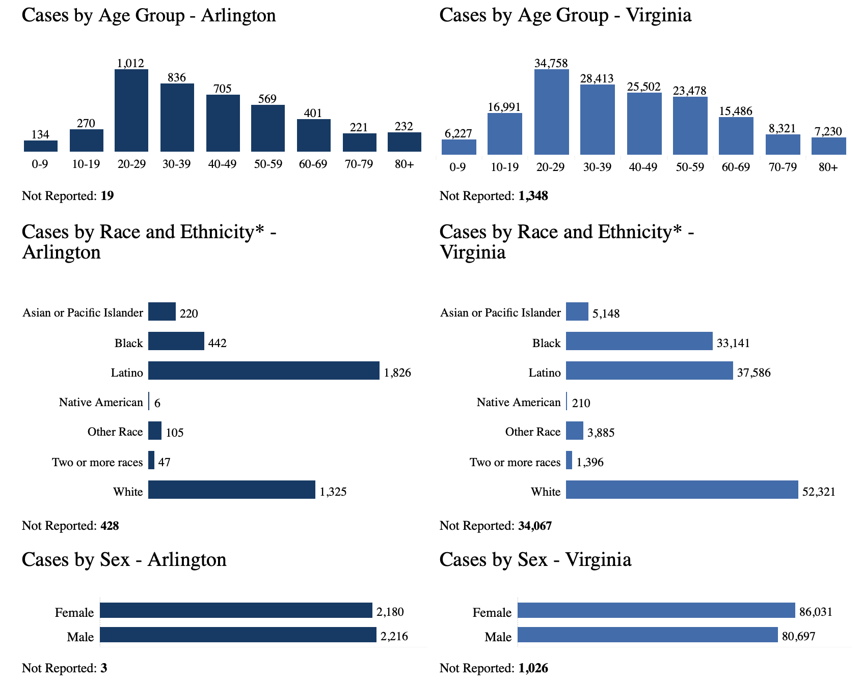 VDH breaks down the number of cases and deaths in Arlington by age, race and ethnicity. The breakdown by age is as follows: