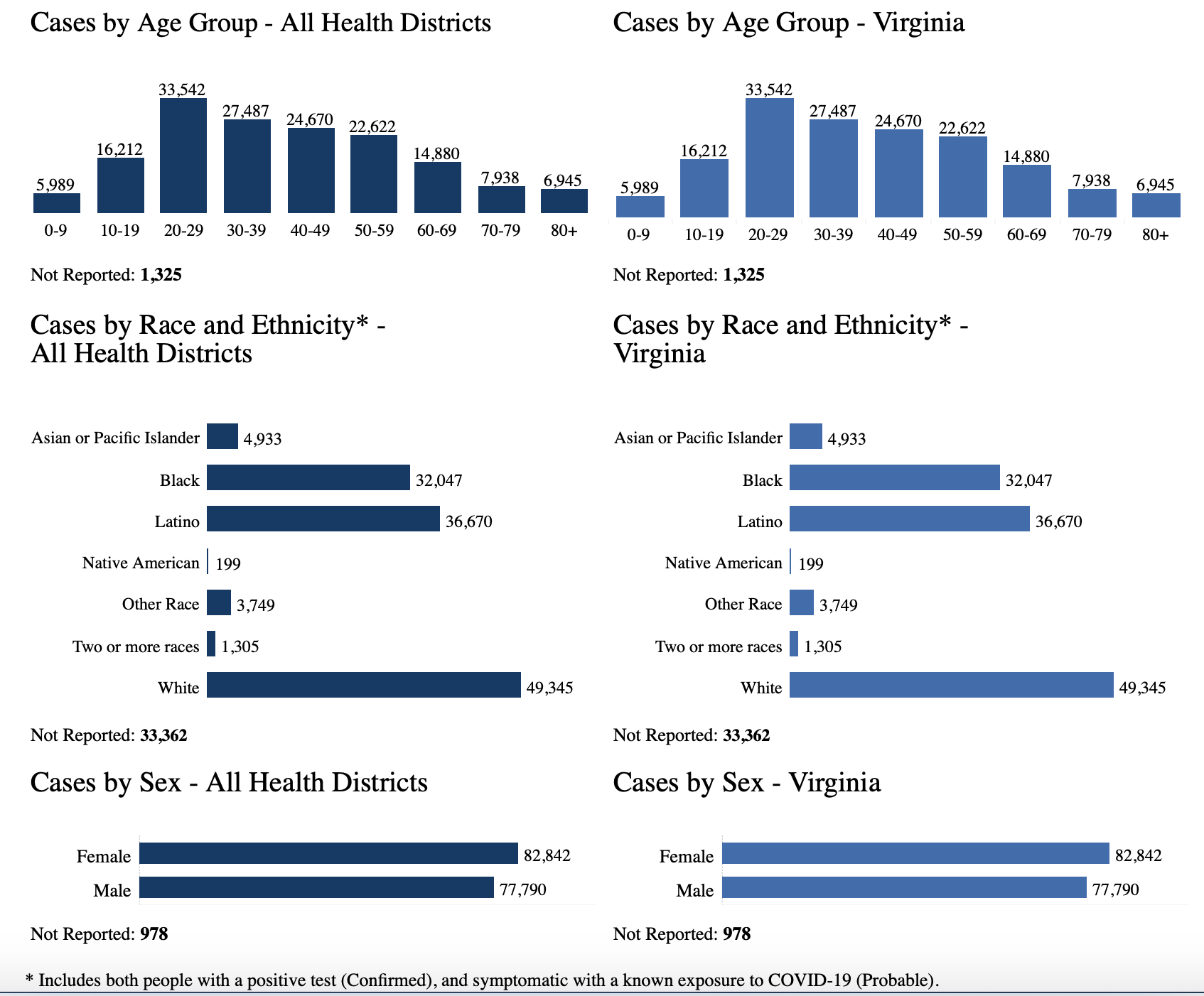 There have been 161,610 total cases statewide, according to data reported by the Virginia Department of Health. In Virginia, there have been 3,381 coronavirus-related deaths to date. There have been a total of 11,628 hospitalized COVID-19 patients.