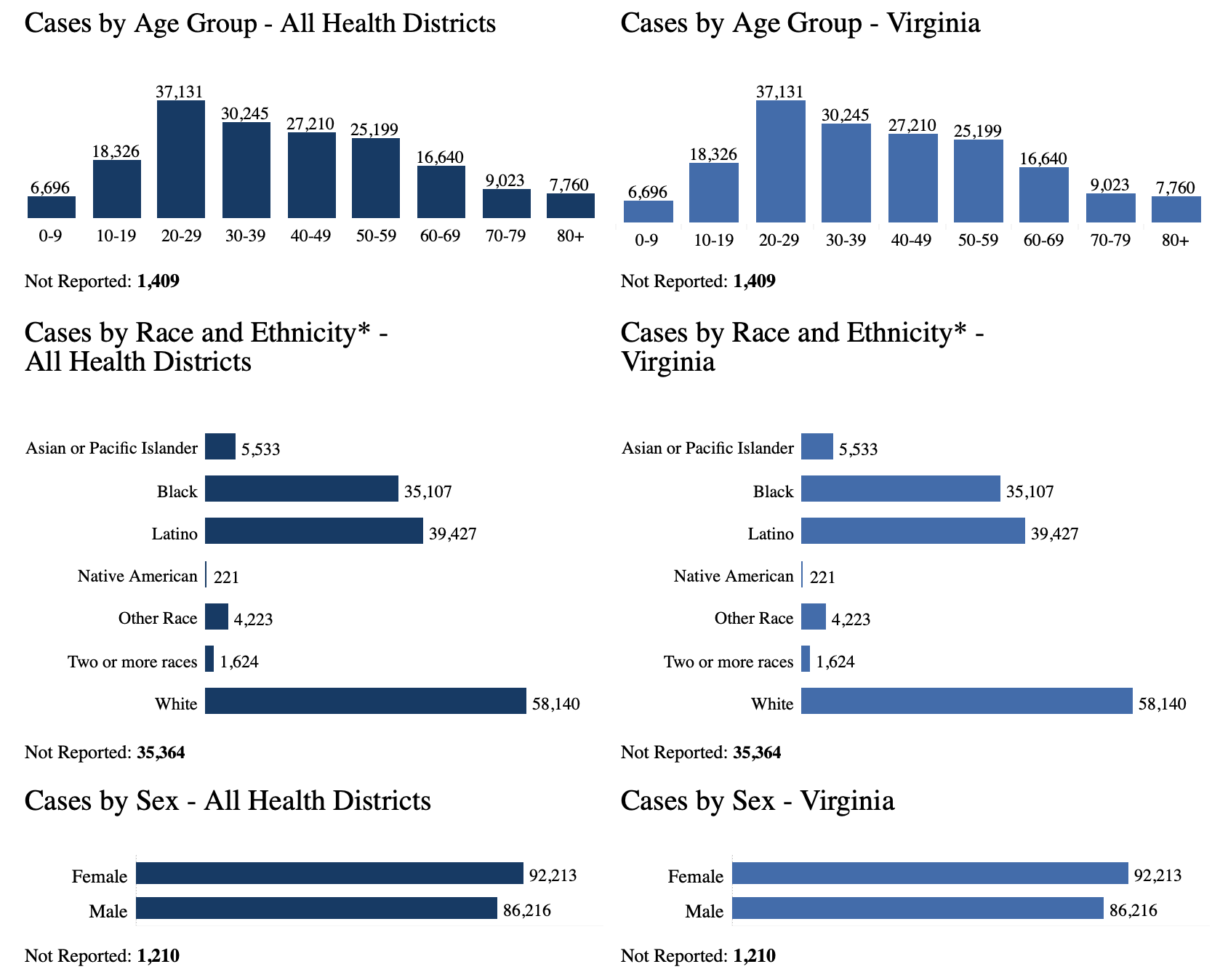 There have been 179,639 total cases statewide, according to data reported by the Virginia Department of Health. In Virginia, there have been 3,643 coronavirus-related deaths to date. There have been a total of 12,511 hospitalized COVID-19 patients.