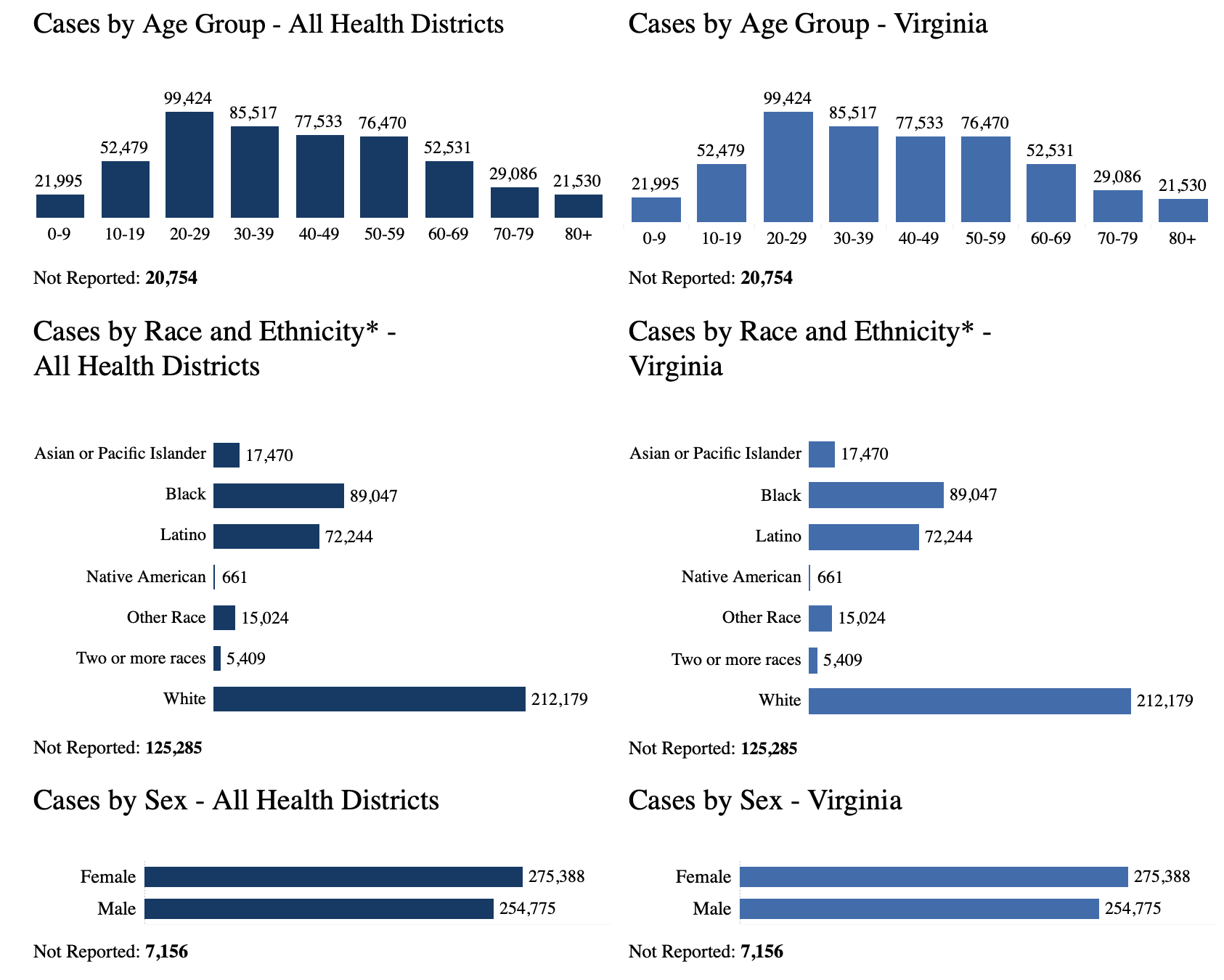 There have been 537,319 total cases statewide, according to data reported by the Virginia Department of Health. In Virginia, there have been 6,932 coronavirus-related deaths to date. There have been a total of 22,470 hospitalized COVID-19 patients.