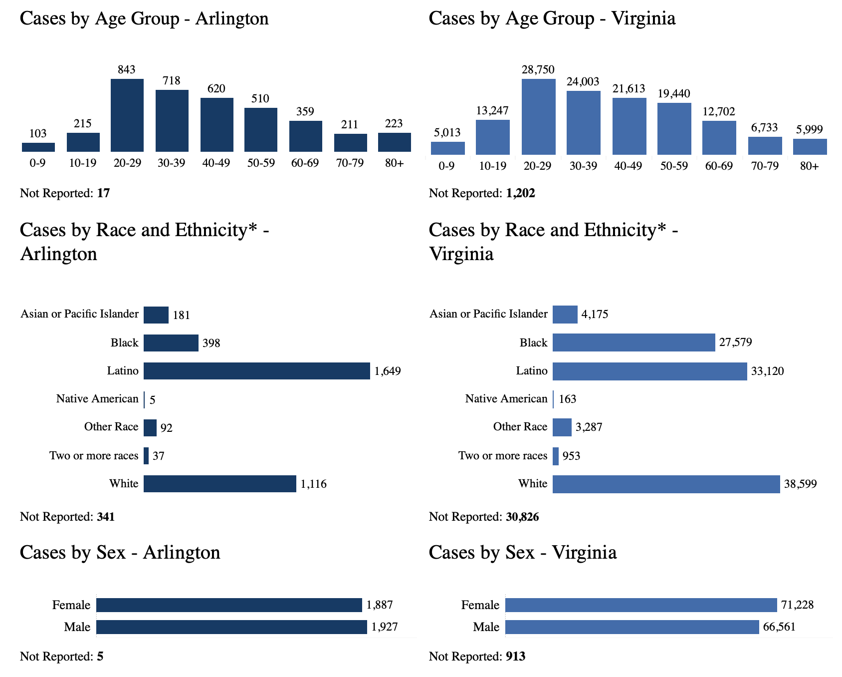 The department of health breaks down the number of cases and deaths in Arlington by age, race and ethnicity. The breakdown by age is as follows: