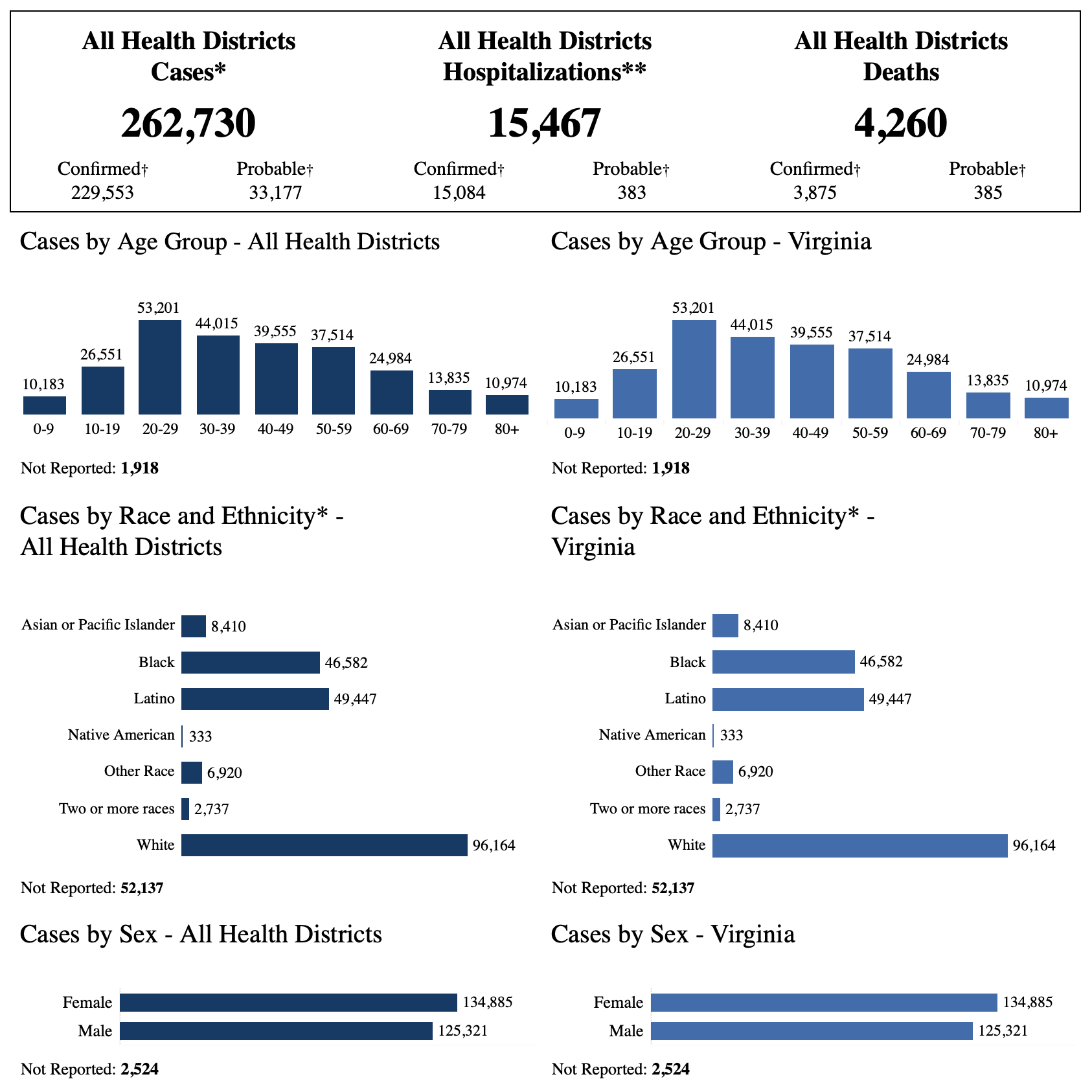 There have been 262,730 total cases statewide, according to data reported by the Virginia Department of Health. In Virginia, there have been 4,260 coronavirus-related deaths to date. There have been a total of 15,467 hospitalized COVID-19 patients.