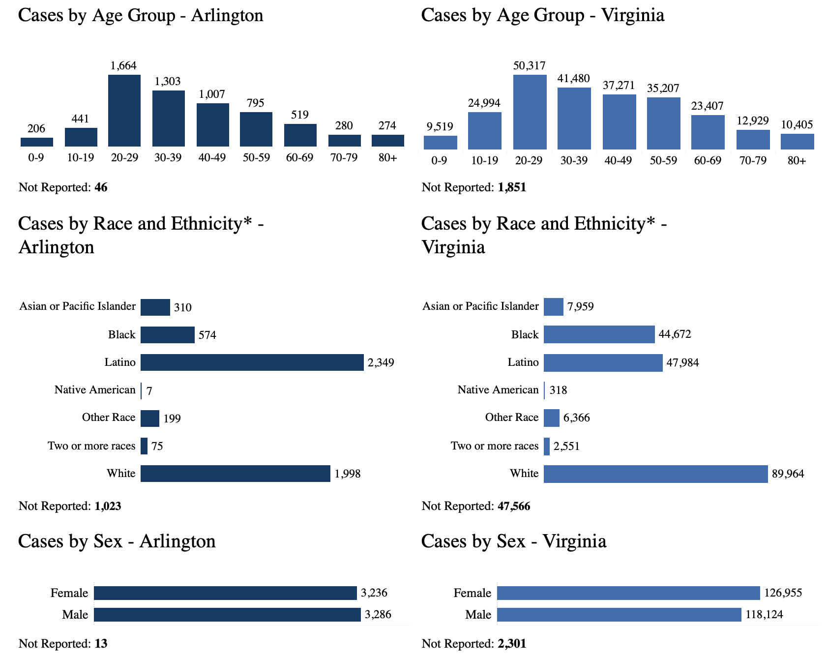 VDH breaks down the number of cases and deaths in Arlington by age, race and ethnicity. The breakdown by age is as follows: