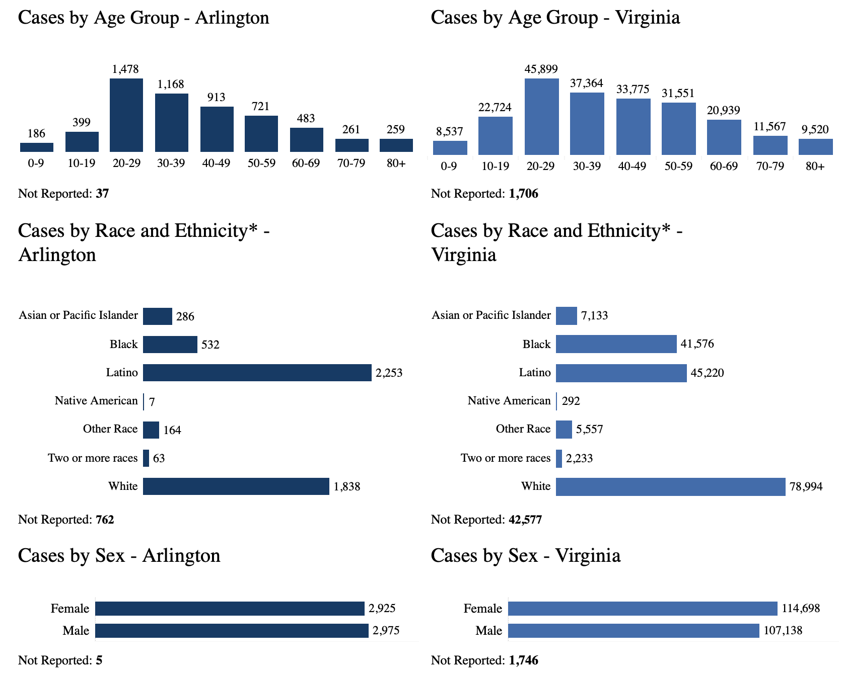 VDH breaks down the number of cases and deaths in Arlington by age, race and ethnicity. The breakdown by age is as follows: