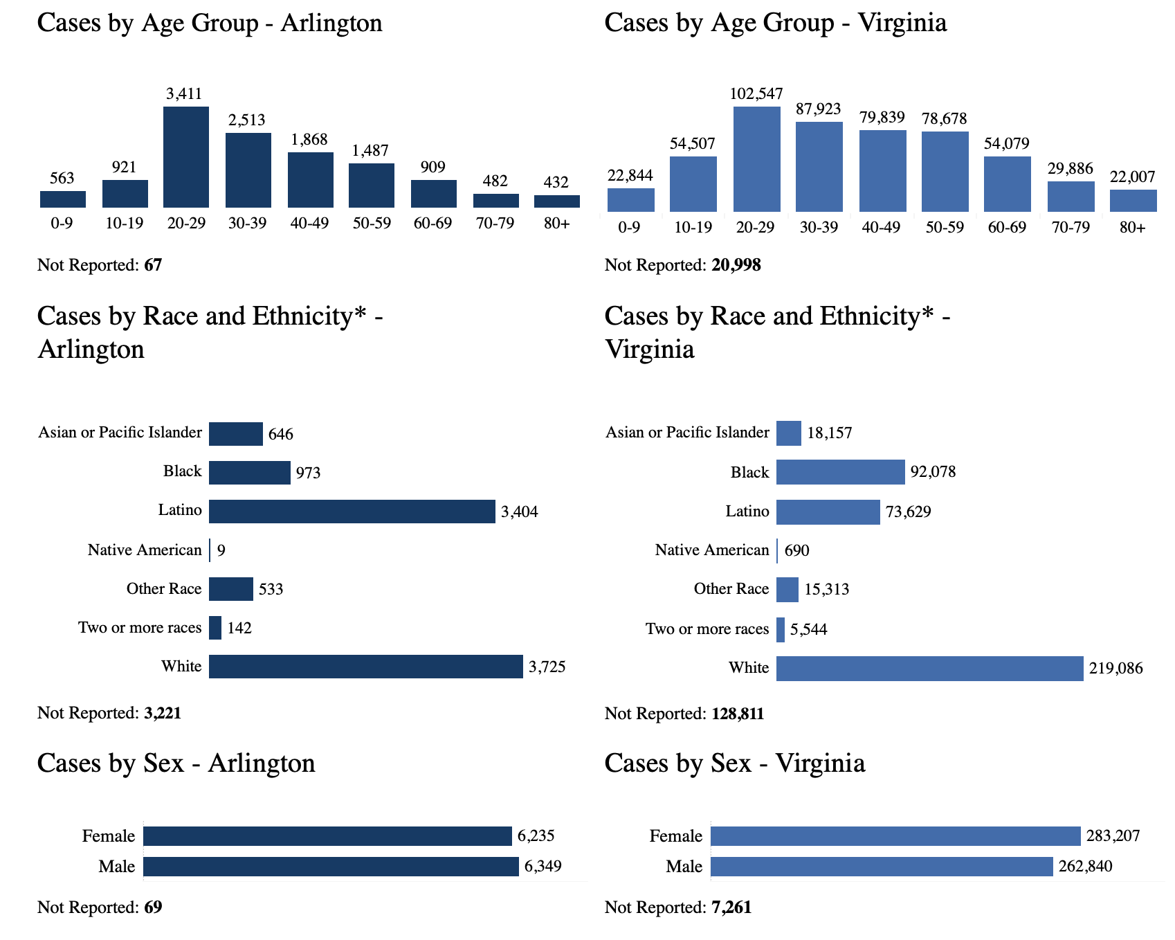 VDH breaks down the number of cases and deaths in Arlington by age, race and ethnicity. The breakdown by age is as follows: