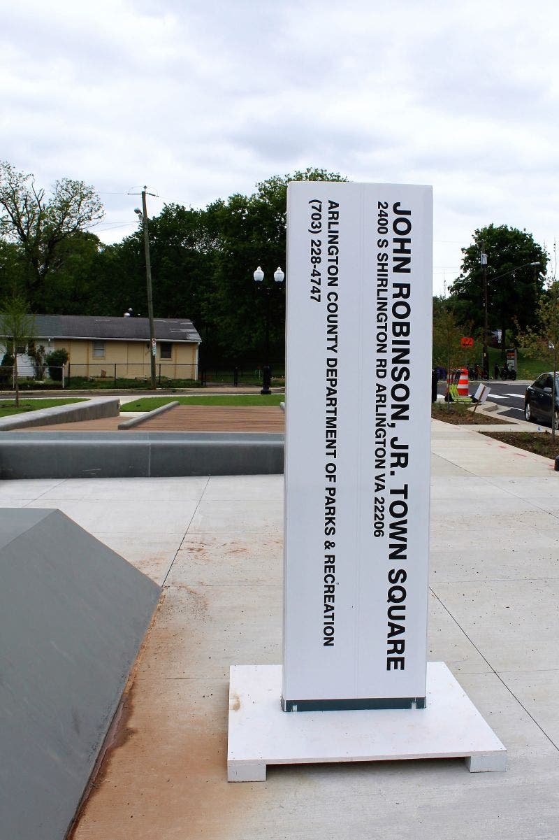 ARLINGTON, VA — Arlington County officials joined members of the Green Valley community Saturday afternoon to celebrate the opening of the John Robinson Jr. Town Square, a large plaza with public art, seating and tables.