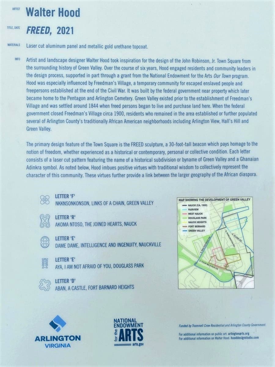 The primary design feature of the town square is the FREED sculpture, a 30-foot-tall structure that pays homage to the notion of freedom. Each letter of the sculpture incorporates patterns featuring the name of the community of Green Valley and a Ghanaian Adinkra symbol.