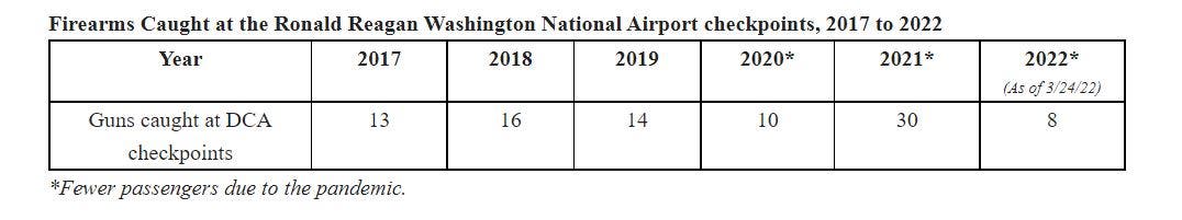 The handgun was the eighth gun detected by TSA officers at Reagan National Airport so far in 2022. In 2021, a total of 30 handguns were confiscated at Reagan National Airport, the most ever in a year, even though the airport saw fewer passengers due to the COVID-19 pandemic.