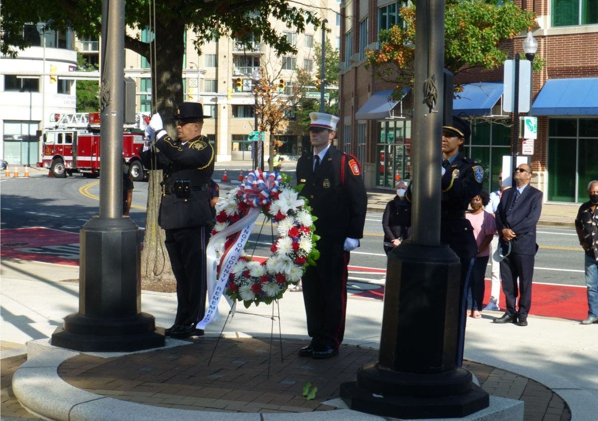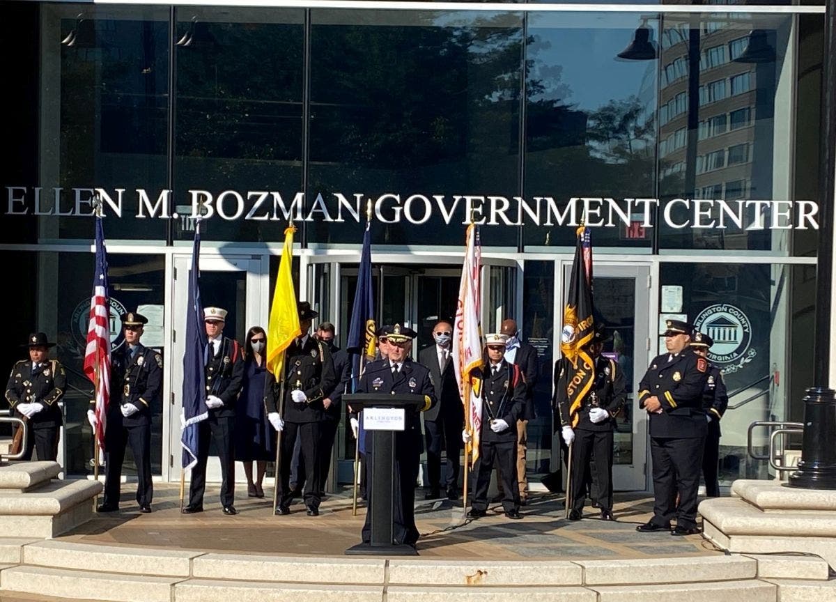 Friday morning's ceremony was held in the plaza outside the Arlington County government center on Clarendon Blvd. The event included a presentation of colors by the Arlington County Public Safety Combined Honor Guard and the laying of a wreath.