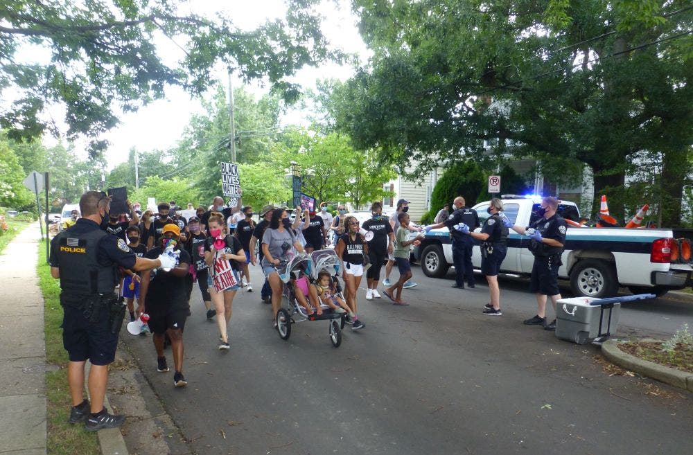 About a mile from the end of the march, between Lyon Park and the Courthouse area, Arlington police officers provided marchers with bottles of cold water.