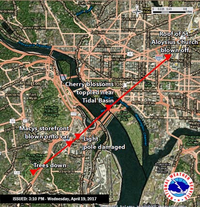 "Video from the National Park Service National Mall and Memorial Parks showed a waterspout over the Potomac River west of the Tidal Basin; however, it is not clear the vertical extent of this waterspout and whether it was sourced from the cloud base, or an independent vortex associated with the gust front," the report continues. "The waterspout then moved onshore near the George Mason Memorial at the Tidal Basin at approximately 1:41 PM EDT. Here, multiple large softwood and hardwood trees, including several ornamental cherry trees, had large branches downed and/or were uprooted around the Tidal Basin. While some minor tree damage was evidenced near the George Mason Memorial on the southwest side of the Tidal Basin, the most concentrated damage was in the grove of trees directly adjacent to the parking lot of the Tidal Basin Marina."