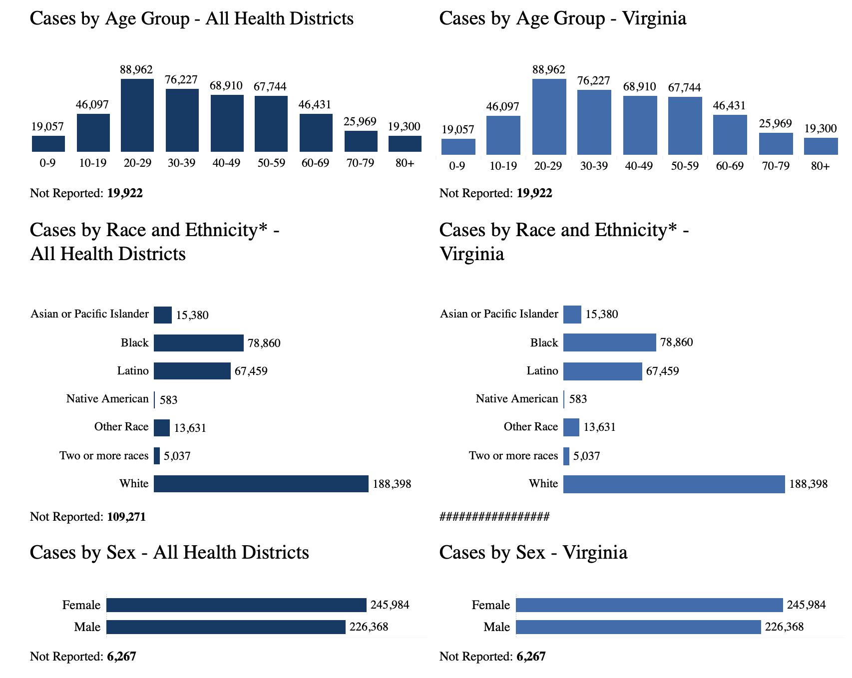 There have been 478,619 total cases statewide, according to data reported by the Virginia Department of Health. In Virginia, there have been 6,081 coronavirus-related deaths to date. There have been a total of 20,764 hospitalized COVID-19 patients.