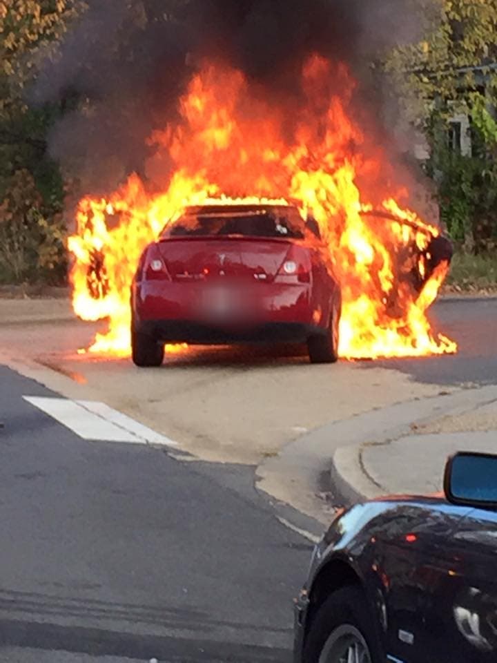 When they arrived, the car was “smoldering,” but quickly became engulfed in flames.