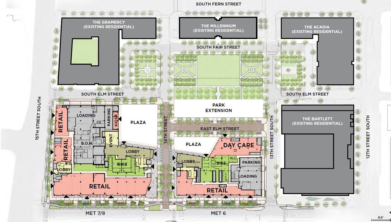 The developer will construct two new public streets on the site, breaking up an existing “super block.” One segment would extend 14th Street S. to South Eads Street and the other would introduce a new segment of South Elm Street between 13th Street S. and 14th Street South. The streets will be complemented by sidewalk and streetscape improvements along all frontages. The developer will continue the Eads Street linear park along S. Eads Street to 15th Street S.