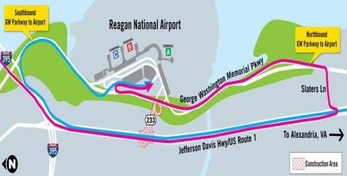 There will be signage directing drivers where to go, but you can also consult the above map if you need to make plans to drive to Reagan Airport this weekend.