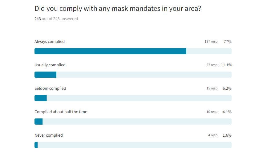 In the survey, 77 percent of readers said they always complied with mask mandates in their communities. Only 2 percent said they never complied. Sixty-five percent of the survey respondents said they still wear a mask in public settings.