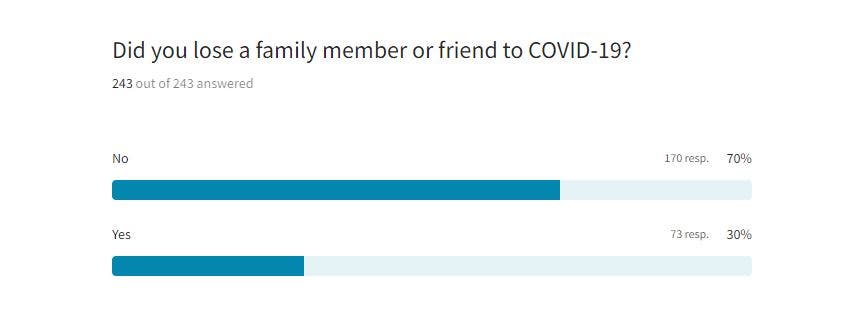 Thirty percent of the respondents said they had a family member who died of COVID-19.