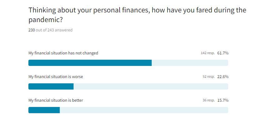 Nearly all respondents — 96 percent — said their employer kept paying them throughout the pandemic.