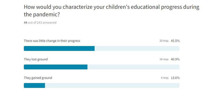 Among the parents who responded to the survey, 46 percent said their children’s educational progress changed little during the pandemic, while 41 percent said their children lost ground. Thirteen percent of parents said their children gained ground in their education during the pandemic.