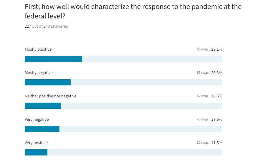 The federal government received the lowest ratings. Twenty-nine percent of survey respondents said the federal response to the pandemic was mostly positive, followed by 23 percent who said it was mostly negative, 18 percent who said it was very negative and 12 percent who said it was very positive.
