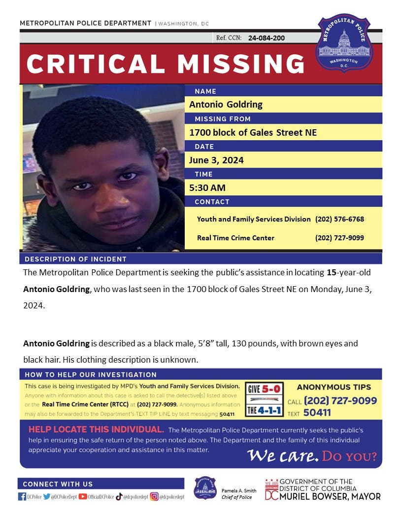 Antonio Goldring was last seen around 5:30 a.m., on June 3, in the 1700 block of Gales Street, Northeast in D.C.
