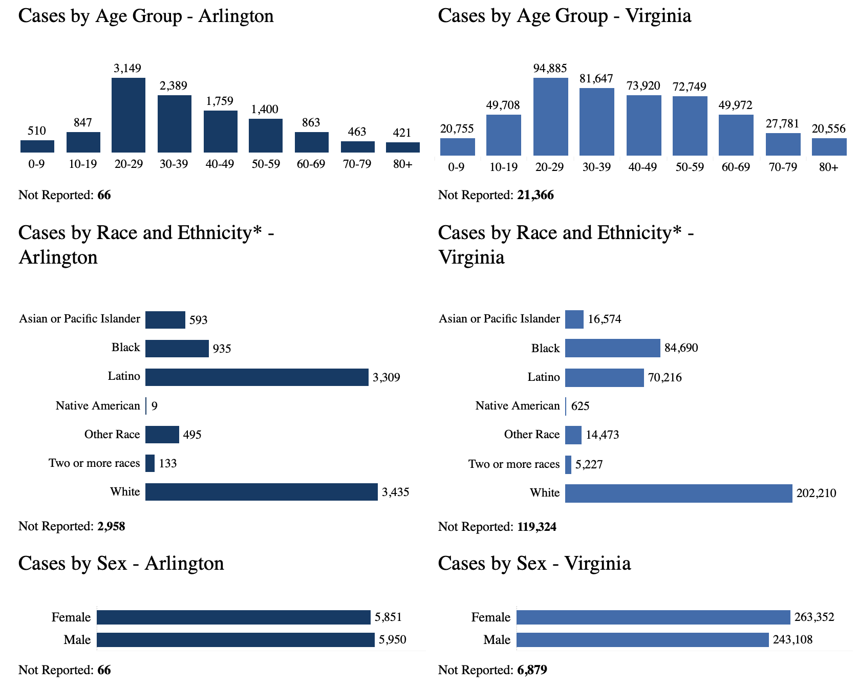 VDH breaks down the number of cases and deaths in Arlington by age, race and ethnicity. The breakdown by age is as follows:
