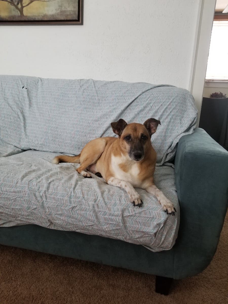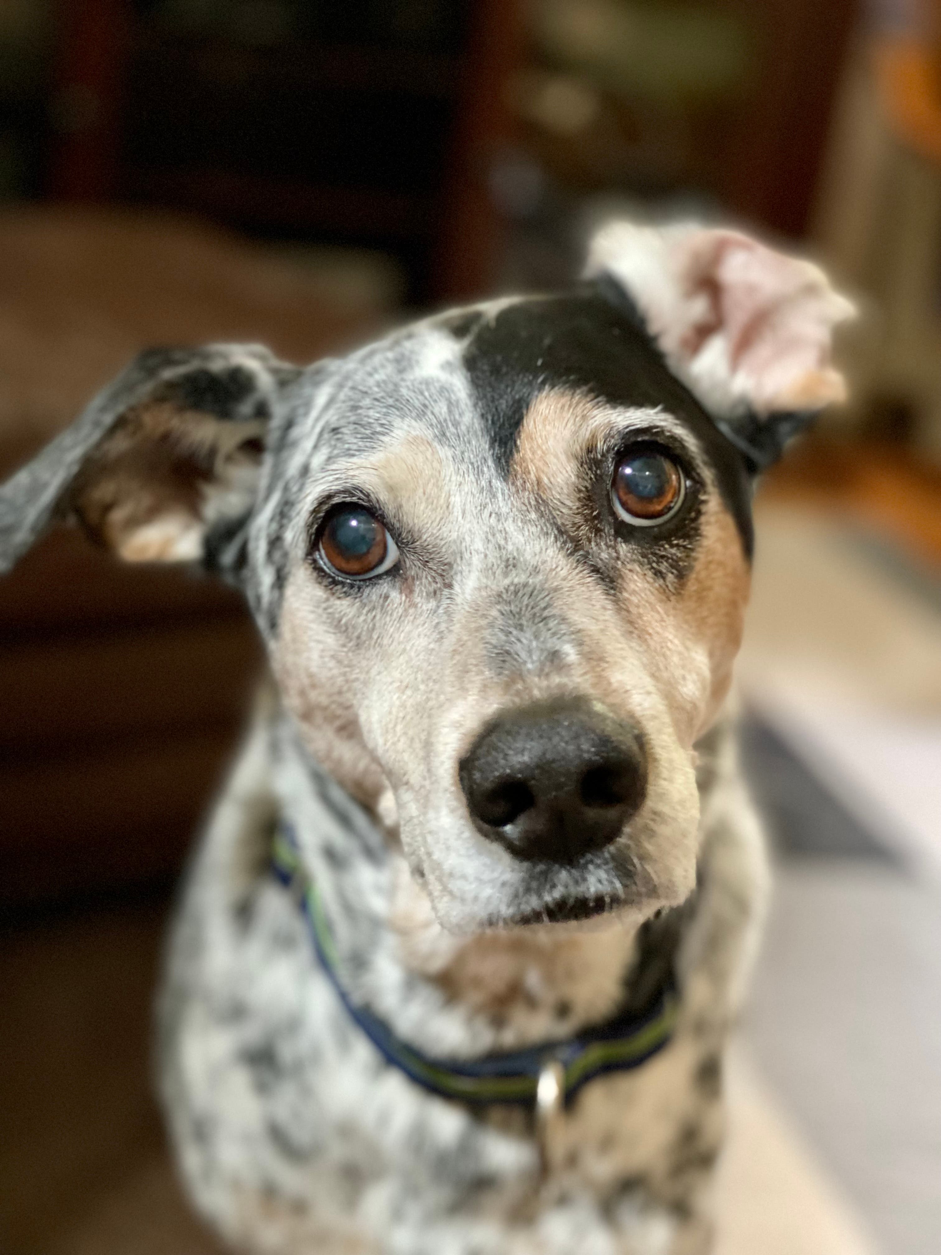 This is Ginger. We rescued her 5 years ago when she was 4 years old. Her DNA test said she is a mix of only 2 breeds: one parent was an Australian Cattle Dog, and the other was a Treeing Walker Coonhound. She’s wicked smart. Her hobbies include sleeping, eating, barking, eating, playing games with her mom, and eating. — Deb Duncan